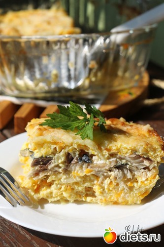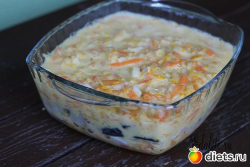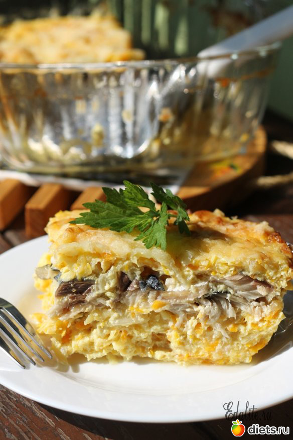 Накрываем форму крышкой или фольгой. Ставим в духовку на 180-200С градусов и выпекаем 30 минут. Затем, достаем и посыпаем тертым сыром на мелкой терке и ставим в духовку без крышки или фольги еще на 15 минут. Запеканка готова!