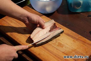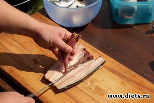 Тушку разрежьте вдоль позвоночника, и она развалится на пласт из двух половинок, объединенных брюшком. Кстати, так гораздо проще удалить внутренности – пока они не разморозились и не потекли. Затем аккуратно вырежьте позвоночник. Тщательно отскоблите черную пленку, выстилающую брюшную полость: она дает горечь. Мелкие остатки удалите бумажной салфеткой. И не забудьте: рыбу мы не моем!