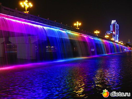 Мост Фонтан радуги (Banpo Bridge) занесен в книгу рекордов Гиннеса как мост, на котором расположен самый длинный в мире фонтан (длина — 1140 м). Мост соединяет два берега реки Ханшуй в южнокорейском городе Сеул и фонтаном стал только в 2009 году. Под музыку, освещенные разноцветными светодиодами струи воды двигаются, исполняя красивый танец.