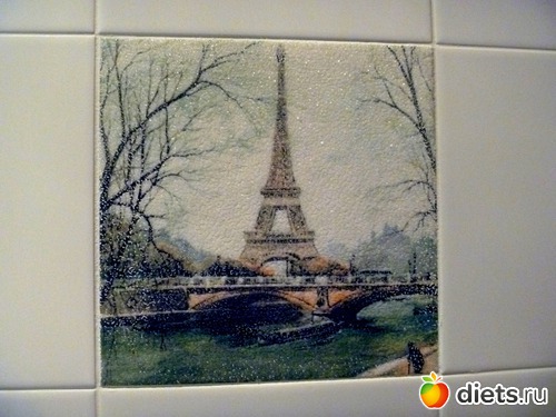 Черничный цвет плитки в сочетании с белым и с декором Французской коллекции - 2011 - именно то, что я хотела. Вот поближе одна из декорированных плиток под акварельный пейзаж