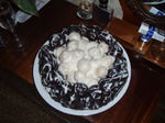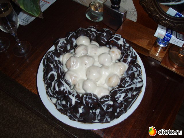 Две трети шариков порциями опускать в темную глазурь и аккуратно выкладывать кругом на подставку для торта. Положить сверху еще 2–3 ряда.