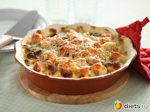 Выложить отваренную капусту и нарезанную рыбу в подготовленную форму. Залить овощи соусом. Выпекать в духовке в течение 20-30 минут; верх должен зарумяниться. Подавать запеканку горячей.