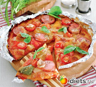 Нарезать охотничьи колбаски и моцареллу кружками. Черри разрезать пополам. Застелить решетку для барбекю тройным слоем фольги, щедро смазать маслом и хорошо прогреть над углями. Слегка растянуть тесто руками, еще раз смазать маслом и выложить на горячую фольгу. Выпекать над углями, пока нижняя сторона теста не подрумянится.