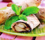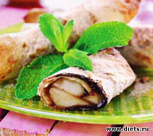 На один угол куска лаваша класть по 5–6 кусочков груши, поливать растопленным шоколадом, сворачивать как блинчик, подгибая открытые края.