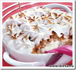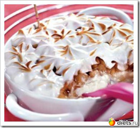 Сверху положить подготовленные яблоки, присыпать ванильным сахаром и половиной сахарной пудры. Белки взбить с оставшейся пудрой в крутую пену. Выложить на яблоки и поставить в разогретую до 160 °С духовку на 30 мин.