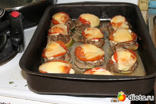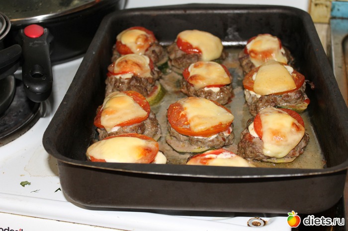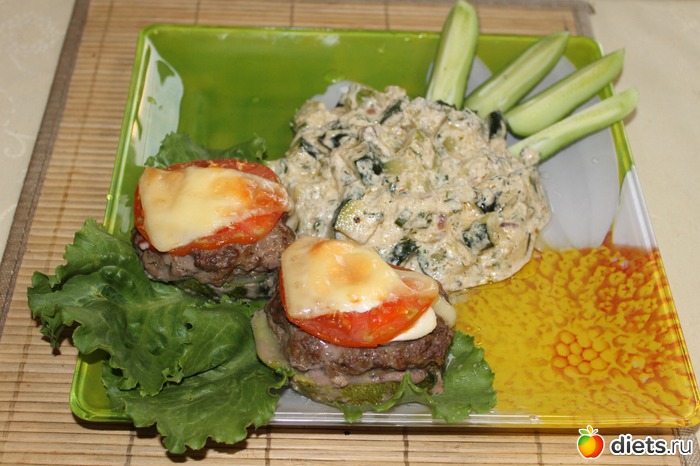 на смазанный противень кладем первым слоем колечко кабачка, смазываем его кетчупом, сверху колтетку, смазываем керчупом, на котлетку колечки репчатого лука, и сверху колечко помидорки, смазываем майонезом и сверху водружаем кусочек сыра.