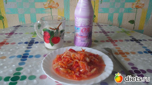 Ужинать буду сейчас, в 18-30 всё той же тушеной капустой, а запью йогуртом 0%. Это из варианта молочка + овощи..