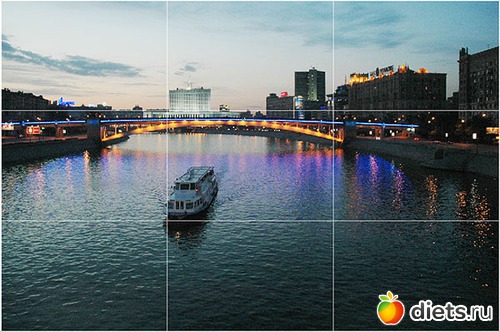 Делим кадр на три равные части по горизонтали и по вертикали. Получилась сетка, которую вы видите на изображении. Правило основано на том, что объекты, расположенные в местах пересечения линий, соответствуют наилучшему зрительному восприятию. Таким образом, значимо важный объект съемки следует располагать или вдоль линий или в точках пересечений этих линий.