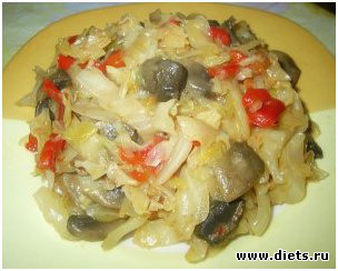 Капусту нашинковать, положить в казанок или кастрюлю с 1 ст.л. разогретого растительного масла, добавить 1 ст.л. воды, тушить в течение 15 минут. Шампиньоны отварить в течение 10 минут, нарезать на кусочки произвольной величины. Лук нарезать полукольцами, обжарить в течение 3-х минут на растительном масле (1 ст.л.), затем добавить к нему нарезанный соломкой болгарский перец и тушить еще 5 минут. Помидор очистить от кожуры, нарезать кубиками, добавить к овощам, тушить еще 5 минут. Добавить к капусте нарезанные шампиньоны и тушеные овощи, добавит уксус, сахар, посолить по вкусу и тушить еще 10-15 минут.