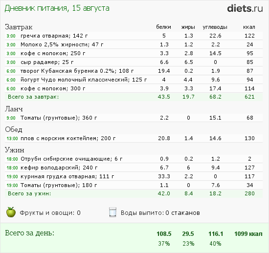 Получился небольшой перебор жиров, зато углеводов маловато. Калорийность в норме. Завтрашнее взвешивание покажет что и как