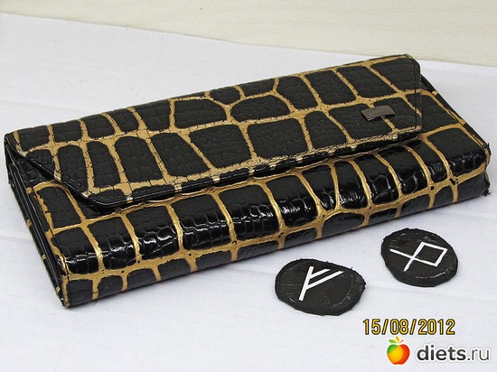 В кармашке с прозрачной вставкой желательно разместить сделанные вами руны Fehu и Othel. Вырезать их либо нарисовать необходимо на кусочке кожи, деревянной пластинке или просто на ткани. Руна Fehu приумножает и притягивает богатство, руна Othel бережет ваш достаток.