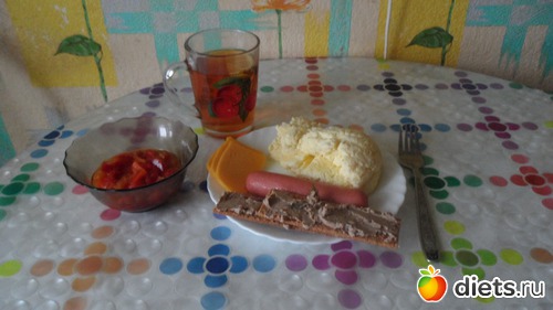 Второй завтрак около 9-00 Омлет, сосиска, криспы с паштетом(баклажаны и грецкие орехи) и лечо (тоже своё!) и сыр. Такой большой завтрак, потому что всё это нельзя после 12, а хочется!!!