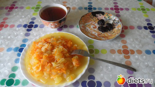 Обед в 13-30 Тушеные овощи - капуста, кабачок, морковка, капелька масла и всё это потушила в мультиварочке! Получилось вкусненько, люблю такие вещи! И с чаем 3 черносливки!