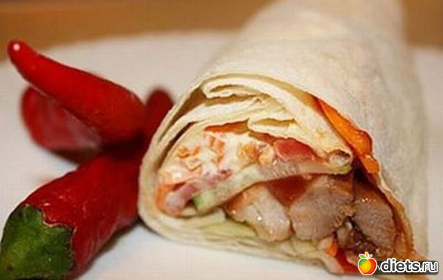 Естественно мясо куриное без шкурки, вместо майонеза сметана с низким содержанием жира+специи, помидор-огурец-морковка-лук-капуста, всего понемногу, ну и лаваш.