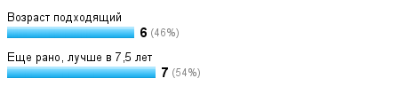 Диме через год будет 6,5 лет (исполнится в середине сентября). Вроде бы возраст подходящий для школы. Я сама так пошла. А если годик подождать, то уже 7,5. Мне кажется, что это поздно. После школы сразу армия. А если 6,5, то вроде бы годик в запасе есть.