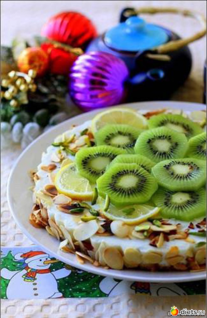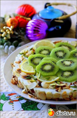 5. Обжарить миндальные пластинки на сухой сковороде без добавления масла, до золотистого цвета и дать им остыть. Очистить киви и нарезать ломтиками и полить мёдом. Вынуть торт из разъемной формы и украсить края пластинками миндаля. Украсить торт ломтиками киви, лимоном, фисташками.