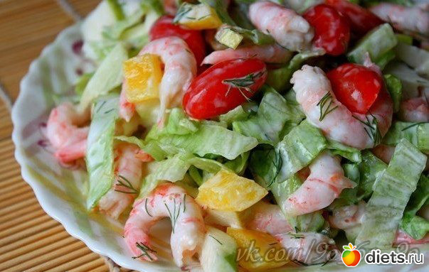 Ингредиенты: салат айсберг (или пекинская капуста), помидоры, огурцы, болгарский перец, зеленое яблоко(кисло-сладкое), отварные креветки.