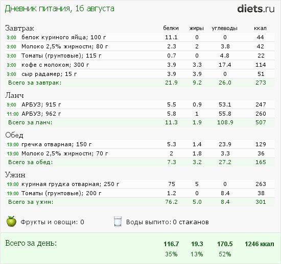 По питанию. Сегодня у меня фруктово-арбузно-углеводный зажор. Но соотношение БЖУ более-менее.
