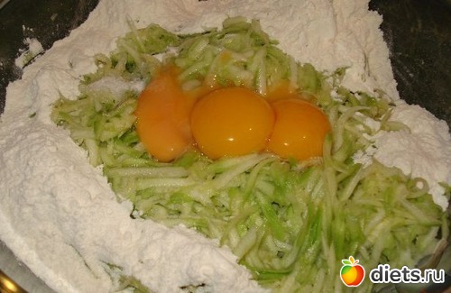 К кабачкам добавляются измельченный лук, желтки трех яиц, соль, разрыхлитель (если у вас под рукой его не оказалось, можно положить просто щепотку соды), мука. Перемешать