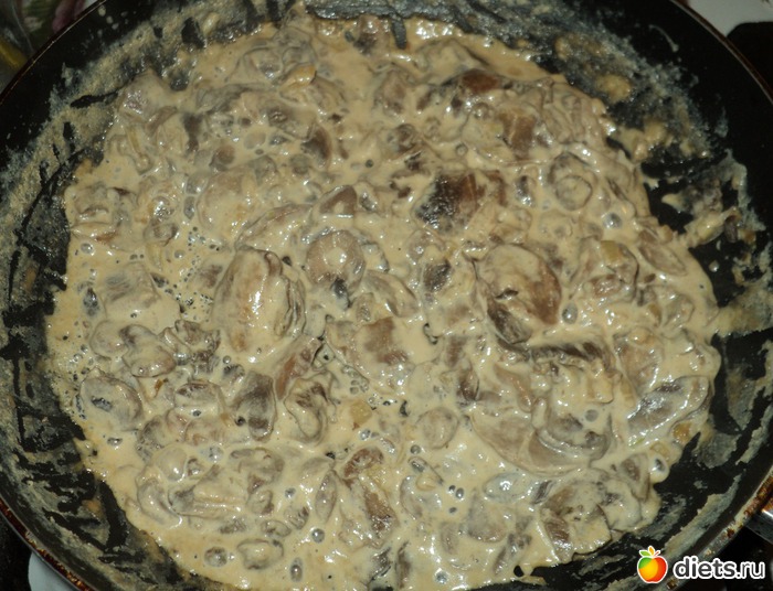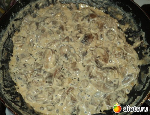 Если используются свежие грибы, они моются, режутся и пассеруются с луком. Доливаются сливки и немного тушатся.