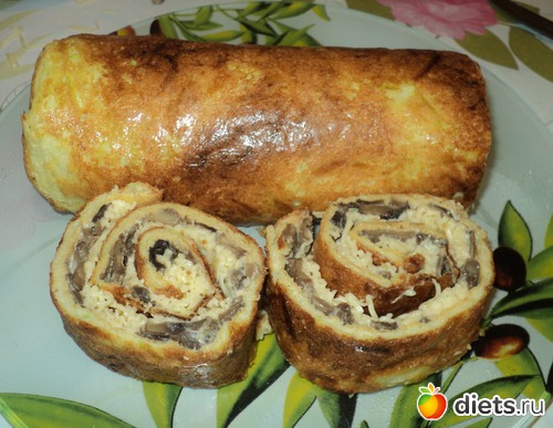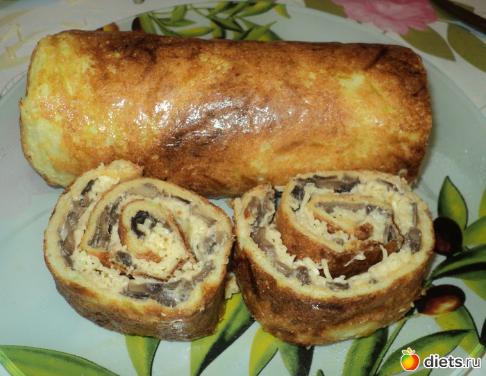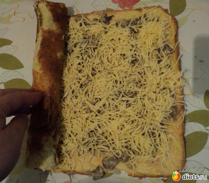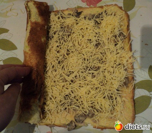 Готовый корж для рулета перевернуть на стол, освободить от бумаги (она может прилипнуть, но под начинкой это будет не заметно) и на эту же поверхность нанести равномерно слой тушеных (жареных) грибов, потом посыпать тертым сыром. И корж (еще теплый) сворачивается рулетом.