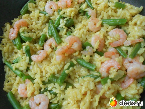В кастрюле с толстым дном или сковороде нагреть оливковое масло, добавить лук и на медленном огне довести лук до прозрачного цвета. Затем добавить рис и помешивать, пока рис не станет слегка бурым. Добавлять горячую воду по одной чашке (в одной чашке развести шафран), не забывая мешать рис. Следующую чашку воды добавлять после того, как выпарится предыдущая. Когда рис будет почти готов, добавить зеленую фасоль и креветки, готовить еще 5 минут. Добавить масло и сыр, перемешать.
