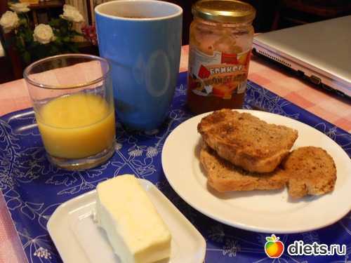 Завтрак - сок, кофе, тосты с маслом и низкокалорийным абрикосовым джемом.