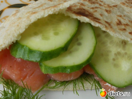 Второй завтрак - пита (половинка) с семгой, огурцами и укропом.