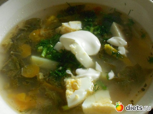 Обед - щи из щавеля с яйцом и сметаной и котлетка с брокколи и помидором.