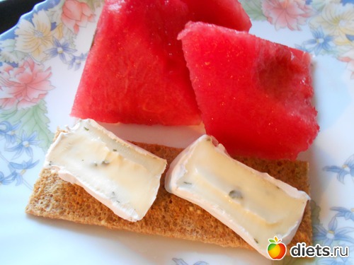 Ужин - арбуз с сыром типа бри с травками и ржаным хлебцем.