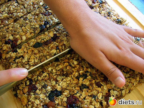 И осторожно выложите мюсли на большую разделочную доску, отделяя бумагу. И теперь острым ножом разрешьте на такие кусочки, какие вам больше нравятся.