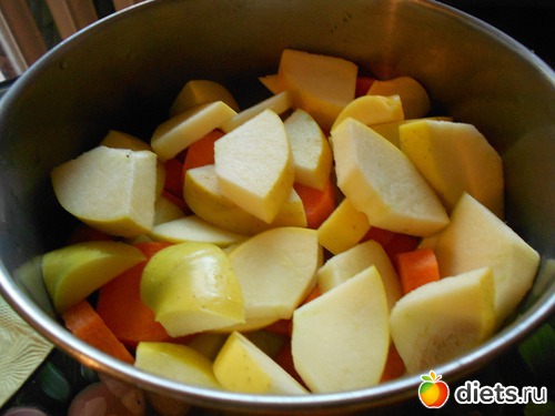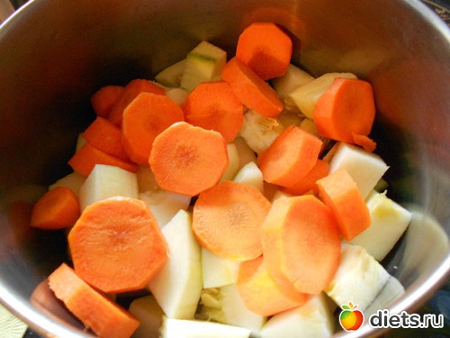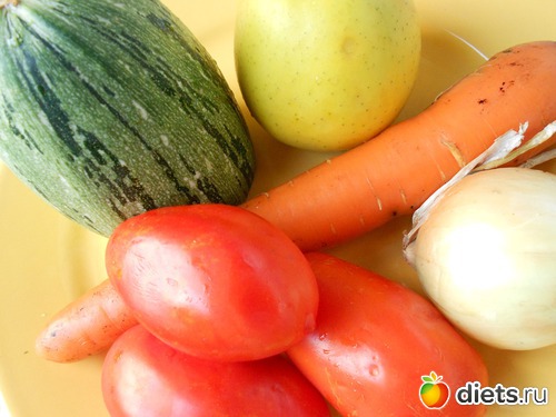 Составим примерно такой натюрморт из кабачка (500 г), моркови (200 г), яблока (200 г), помидоров (200 г), репчатого лука (60 г).