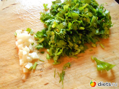 Еще нам понадобятся 1 измельченный зубчик чеснока и мелко нарезанная зелень (петрушка, сельдерей, кинза).