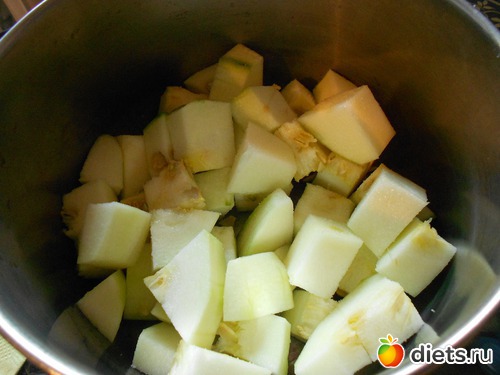Кабачки чистим, режем кубиками, присаливаем, укладываем в кастрюльку-сотейник: