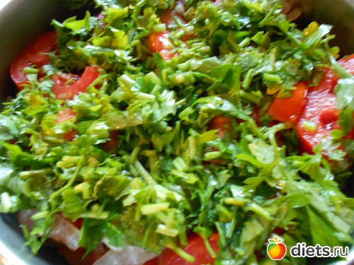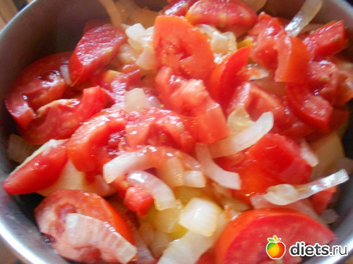 а сверху - пассерованные на подсолнечном масле лук (полукольцами) и дольки помидора: