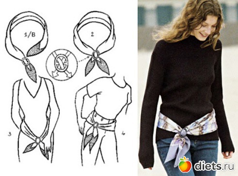 Платок можно также использовать как декоративный пояс, если его повязать на талии, как это делается в народном костюме восточных стран или в цыганском народе. Особенно это подойдет для стройных женщин.