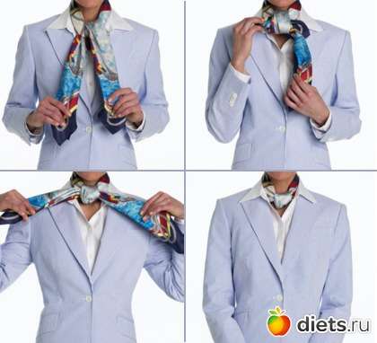 При желании можно так же завязывать легкие шарфы узлами, предназначенными для шейных платков, которые часто заменяют шарфы, особенно на летних нарядах, деловых костюмах и даже вечерних платьях.