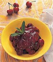 Залить вишни на блюде застывающим соком. Дать остыть при комнатной температуре, затем поставить в холодильник. Подать, украсив веточкой мяты.