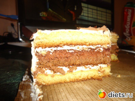 коржи - бисквитные(4 яйца,стакан сахара,стакан муки,немного соды).В коричневый корж добавить какао по желанию.