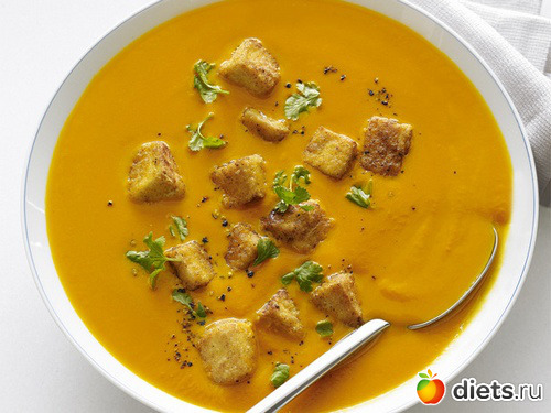 3. Перелить суп частями в блендер и измельчить в пюре, добавить кипяченую воду при необходимости. Приправить солью и перцем. Перелить в супницу и посыпать жареным тофу. Посыпать листьями кинзы, по желанию.