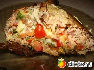 Горбушу выпотрошить, удалить жабры, отрезать плавники и хвост. Расширить руками разрез на пузе, отделяя реберные кости и хребет от мякоти. Ножницами отрезать хребет около головы и хвоста и удалить его. Удалить все внутренние косточки. Получается как бы такой "карман". Рыбу внутри поперчить.