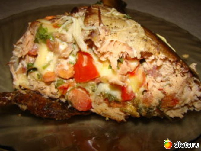 Полученную начинку положить в рыбий "карман", зашпилить зубочисткми либо зашить ниткой.