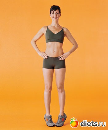 Примите исходное положение — руки на поясе, носки вместе, пятки врозь. Медленно приподнимитесь на носочки, задержитесь в этом положении на три-четыре секунды и вернитесь в исходную позицию. Спину держите прямо, подбородок — параллельно полу. Сделайте три серии по 15 раз, в каждой серии ускоряясь на пяти последних повторах.