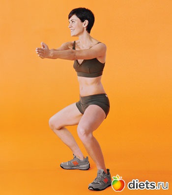 Встаньте прямо, стопы чуть шире плеч, носки развернуты в стороны, руки поставьте на талию или вытяните вперед, как показано на фото. На вдохе присядьте, не отрывая пяток от пола, держа спину прямо и согнув колени под прямым углом. Старайтесь не разводить их в стороны. На выдохе вернитесь в исходное положение. Повторите 20–25 раз.