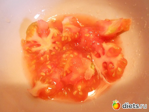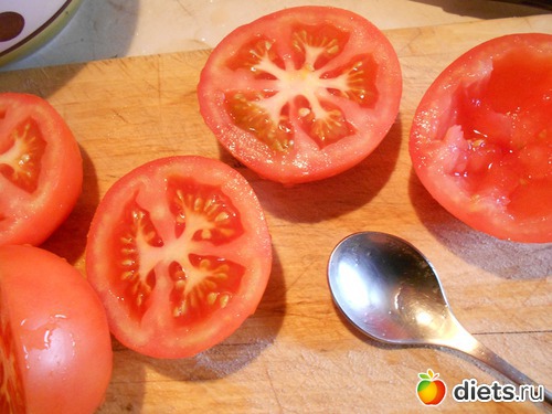 Взяла 3 довольно крупных помидора, разрезала их пополам, ложечкой вынула мякоть с семенами.