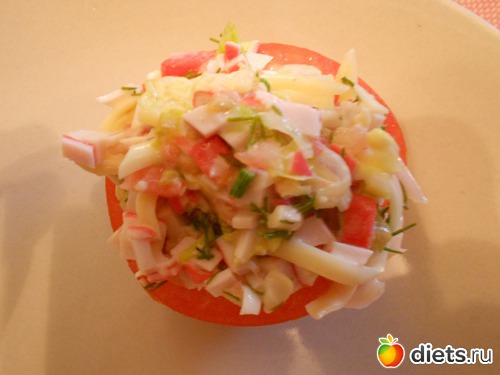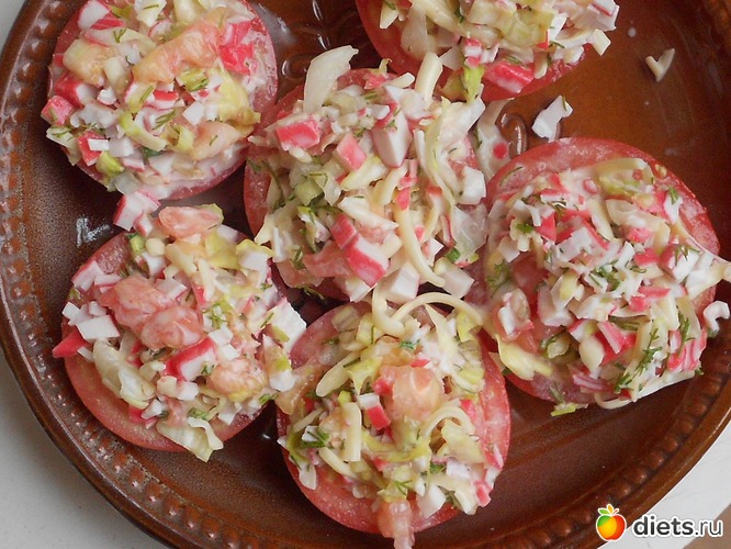 Сделав "микс" из найденных в журналах и интернете рецептов, приготовила помидоры, фаршированные крабовыми палочками.