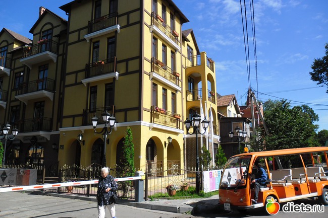 Этот дом - новострой, но рядом оставливается маленький автобусик, видите его.? На нем можно прокатиться по городу и предназначен он для курортников. Но на наших глазах бабуля вывалилась из него с кучей пакетов, то есть местные его тоже в своих целях используют!