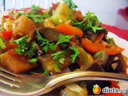В качестве пряной приправы смолоть в мини-резке петрушку с чесноком, солью и жгучим красным перцем. Добавить к овощам за 10 минут до окончания тушения. Перемешать. Можно добавить соевый соус.