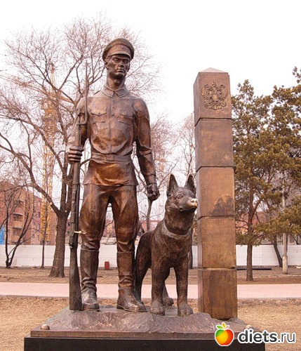 Жителей и гостей города Благовещенска встречает трехметровый пограничник в форме 20-х годов прошлого века, сурово взирающий на тот берег Китая. Он крепко сжимает в одной руке винтовку, а другой уверенно держит бронзовый поводок. У его ног настороженно замер пес.