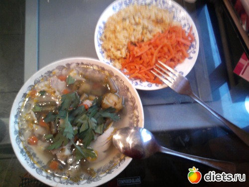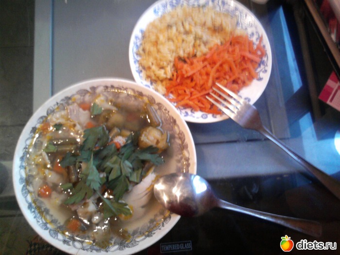 Обедала в 16,30 супчиком из овощей с петрушкой + рис и морковь по-корейски, но не острая. Рис, правда я не одолела